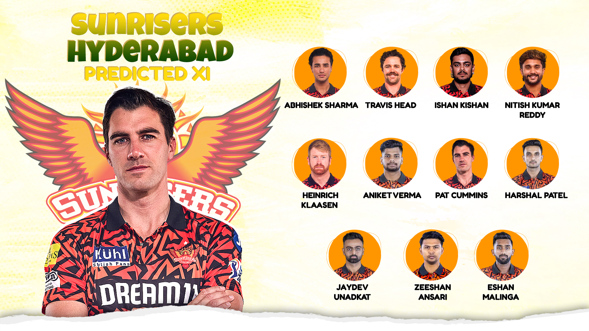 अभिषेक शर्मा, ट्रैविस हेड, ईशान किशन, नितीश कुमार रेड्डी, हेनरिक क्लासेन (विकेटकीपर), अनिकेत वर्मा, पैट कमिंस (कप्तान), हर्षल पटेल, जयदेव उनादकट, जीशान अंसारी, ईशान मलिंगा