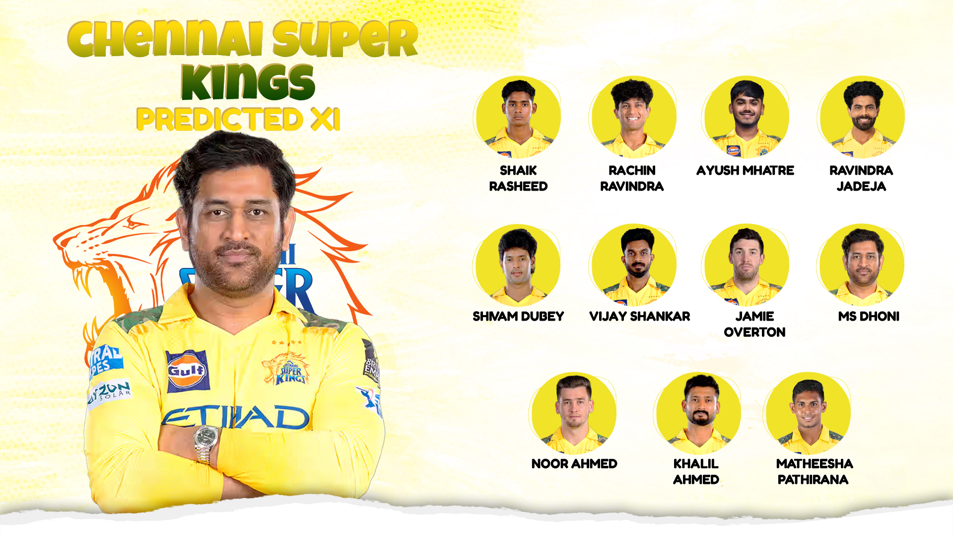 शेख रशीद, रचिन रवींद्र, आयुष म्हात्रे, रवींद्र जड़ेजा, शिवम दुबे, विजय शंकर, जेमी ओवरटन, एमएस धोनी (कप्तान और विकेटकीपर), नूर अहमद, खलील अहमद, मथीशा पथिराना