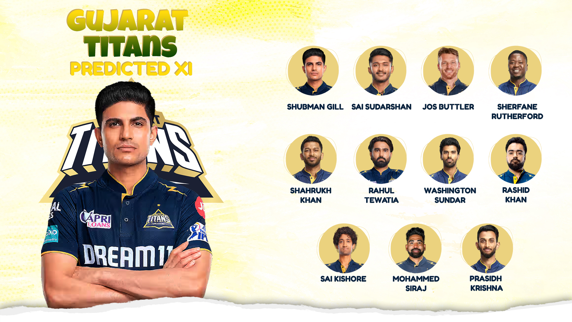 साई सुदर्शन, शुबमन गिल (कप्तान), जोस बटलर (विकेटकीपर), वाशिंगटन सुंदर, शाहरुख खान, राहुल तेवतिया, करीम जनत, राशिद खान, रविश्रीनिवासन साई किशोर, मोहम्मद सिराज, प्रिसिध कृष्णा