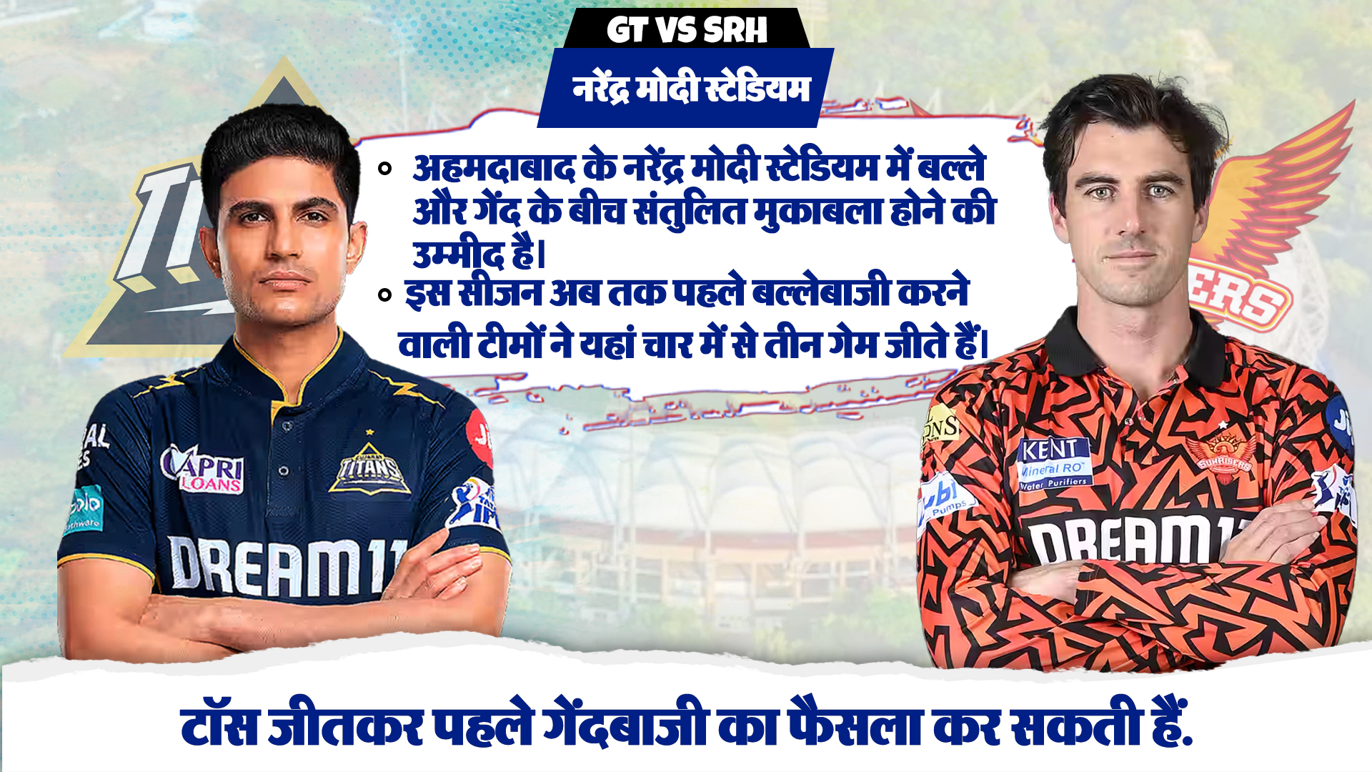 आईपीएल 2025 का 51वां मैच 02 मई को गुजरात टाइटन्स और सनराइजर्स हैदराबाद के बीच अहमदाबाद के नरेंद्र मोदी स्टेडियम में खेला जाएगा। बता दें गुजरात को 28 अप्रैल को जयपुर में राजस्थान रॉयल्स के खिलाफ़ मिली हार के बाद वापसी करना होगा। शुभमन गिल की अगुआई वाली टीम ने यह मैच आठ विकेट से गंवा दिया, जिसका क्रेडिट वैभव सूर्यवंशी को जाता है।