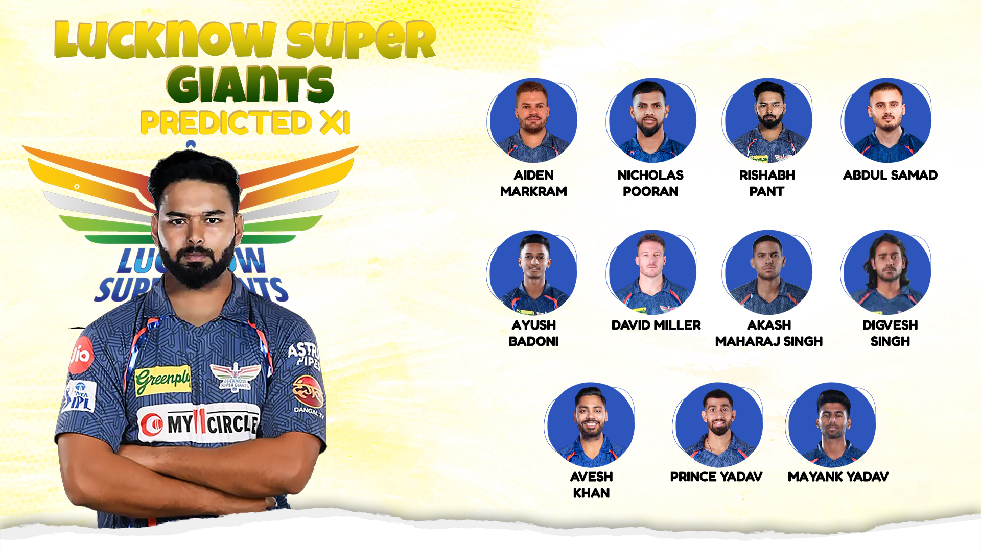एडेन मार्करम, निकोलस पूरन, ऋषभ पंत (कप्तान और विकेटकीपर), अब्दुल समद, आयुष बडोनी, डेविड मिलर, आकाश महाराज सिंह, दिगवेश सिंह राठी, अवेश खान, मयंक यादव, प्रिंस यादव