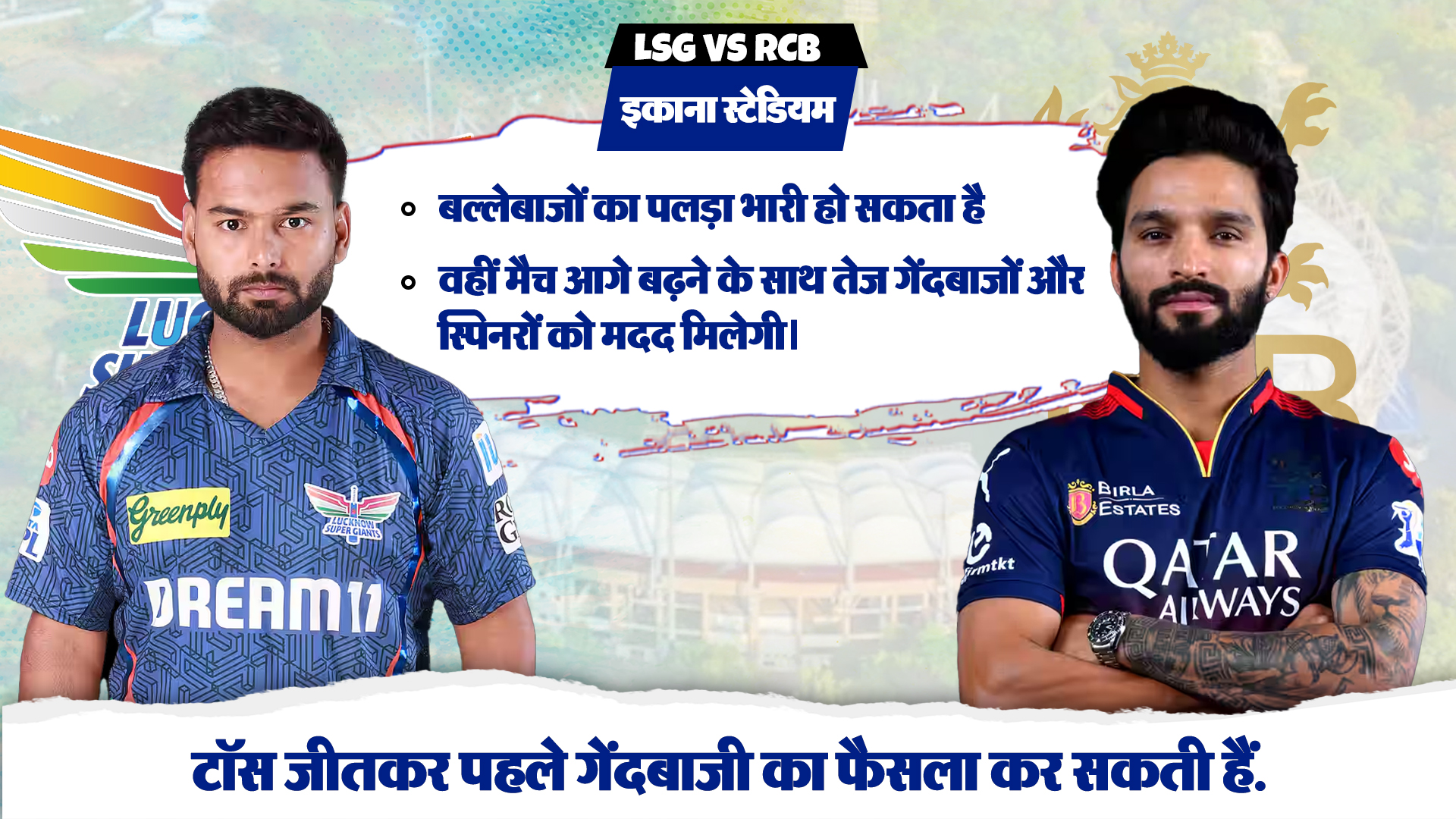 लखनऊ सुपर जायंट्स और रॉयल चैलेंजर्स बंगलुरु के बीच आईपीएल 2025 का 59 वां मुकाबला लखनऊ के इकाना स्टेडियम में खेला जाएगा। बता दें एलएसजी इस समय लगातार तीन मैच हार कर आएगी। लखनऊ ने आखिरी मैच धर्मशाला में पंजाब किंग्स के खिलाफ़ खेला जहां उन्हें हार का सामना करना पड़ा था। दूसरी ओर, आरसीबी आखिरी मैच चेन्नई सुपर किंग्स के खिलाफ घरेलू मैदान पर खेला गया। यह मुकाबला बेहद रोमांचक रहा।