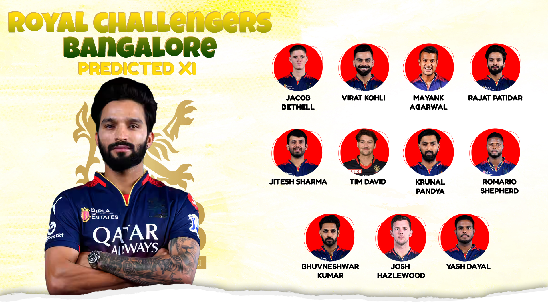 जैकब बेटेल, विराट कोहली, देवदत्त पडिक्कल, रजत पाटीदार (कप्तान), जितेश शर्मा (विकेटकीपर), टिम डेविड, क्रुणाल पंड्या, रोमारियो शेफर्ड, भुवनेश्वर कुमार, जोश हेज़लवुड, यश दयाल
