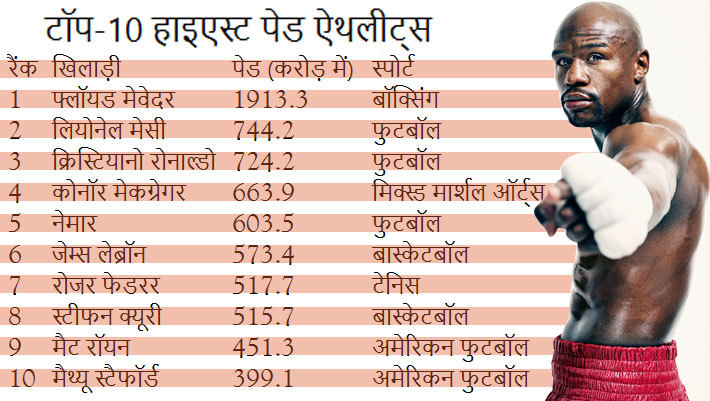 मेवेदर के बाद दूसरा नंबर अर्जेंटीना के फुटबॉलर लियोनेल मेसी का आता है। उनकी सालाना कमाई 744.2 करोड़ रुपये है, जबकि 724.2 करोड़ रुपये के साथ पुर्तगाल के स्टार फुटबॉलर क्रिस्टियानो रोनाल्डो तीसरे नंबर पर हैं। मेवेदर से फाइट हारने वाले मिक्स्ड मार्शल ऑर्ट्स चैंपियन मेकग्रेगर चौथे नंबर पर हैं, जबकि ब्राजील के फुटबॉलर नेमार जूनियर का स्थान 5वां है। इस लिस्ट में लेजंड रोजर फेडरर सहित टेनिस से 4 खिलाड़ी हैं। ये सभी पुरुष हैं।