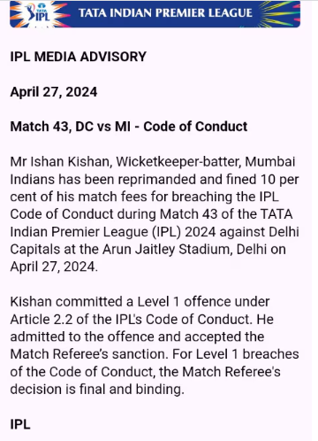 बीसीसीआई ने एक बयान में कहा, ” किशन ने आईपीएल की आचार संहिता के अनुच्छेद 2.2 के तहत लेवल 1 का अपराध किया है. उन्होंने अपराध स्वीकार कर लिया है और मैच रेफरी की मंजूरी स्वीकार कर ली है. आचार संहिता के लेवल 1 के उल्लंघन के लिए, मैच रेफरी का निर्णय अंतिम और बाध्यकारी है.”बोर्ड ने आगे कहा, ” ईशान किशन पर आईपीएल की ARTICLE 2.2 के तहत लेवल 1 के अपराध का आरोप लगाया गया है. इसमें क्रिकेट के मानदंडों के बाहर की कार्रवाइयों को शामिल है, जिसमें विज्ञापन बोर्ड, बाउंड्री फेंस और अन्य फिक्स्चर को नुकसान पहुंचानेके साथ ही मैच के दौरान क्रिकेट उपकरणों का दुरुपयोग शामिल है.”