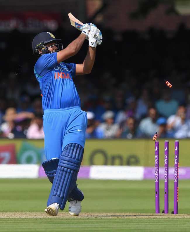 टीम को एक के बाद एक तीन झटके लगे। भारत की ओपनिंग जोड़ी पवेलियन लौट चुकी थी। रोहित शर्मा मार्क वुड की गेंद को पढ़ नहीं पाए और 15 रन के स्कोर पर बोल्ड हो गए। अगले ओवर में धवन की चलते बने। उन्होंने 36 रनों का योगदान दिया। इसके बाद बल्लेबाजी करने आए केएल राहुल ने आज फिर निराश किया और बिना कोई खाता खोले आउट हो गए। दस ओवर तक भारत का स्कोर दो विकेट पर 57 रन था। उस समय शिखर धवन का साथ कोहली दे रहे थे। धवन 30 गेंदों में 36 रन बना चुके थे वहीं विराट 4 गेंदों में 3 रन बना चुके थे। पहले ओवर में धीमी शुरुआत के बावजूद टीम इंडिया ने इंग्लैंड के खिलाफ पहले 5 ओवरों में बिना कोई विकेट खोए 28 रन बना लिए थे। शिखर धवन 13 गेंदों में 17 रन बना कर खेल रहे थे तो रोहित शर्मा ने 17 गेंदों में 8 रन बनाए थे। इंग्लैंड ने अपनी पारी के पहले 5 ओवर में 27 रन बनाए।