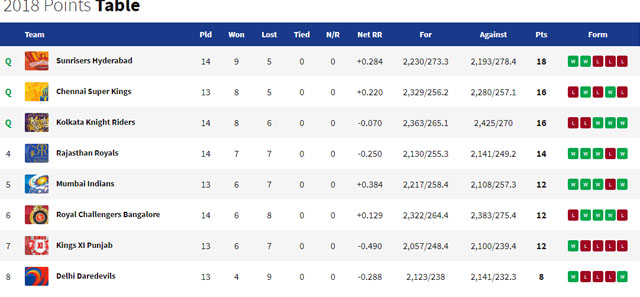 इसके पहले सनराइजर्स हैदराबाद और चेन्नई सुपरकिंग्स पहले ही टॉप-2 टीम पोजिशन हासिल कर चुकी थी।