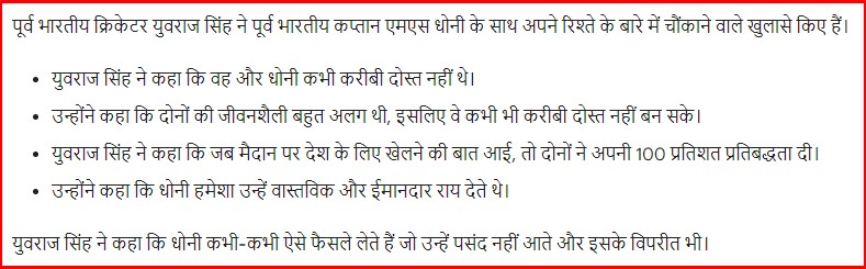 उसमें वो कप्तान थे। मैं उप-कप्तान था. जब मैं टीम में आया तो 4 साल जूनियर था। जब आप कप्तान और उप-कप्तान होते हैं। तो निर्णय में मतभेद होंगे, “युवराज सिंह ने कहा। कई वर्षों तक मंच साझा करने के बाद, धोनी और युवराज सिंह दोनों भारतीय टीम के लिए अपूरणीय खिलाड़ी बन गए। कुछ सबसे बड़े खिताब एक साथ जीतकर, धोनी और युवराज की साझेदारी ने प्रशंसकों को पिछले कुछ वर्षों में कुछ अविस्मरणीय क्षण दिए हैं। कभी-कभी उन्होंने ऐसे फैसले लिए जो मुझे पसंद नहीं आए युवराज इसके अलावा, युवराज सिंह ने यह भी कहा कि कभी-कभी एमएस धोनी ऐसे फैसले लेते हैं। जो उन्हें पसंद नहीं आते और इसके विपरीत भी। हालाँकि, उन्होंने कहा कि हर टीम में ऐसा ही होता है, और यह भी कहा कि कैसे धोनी हमेशा उन्हें वास्तविक और ईमानदार राय देते थे।
